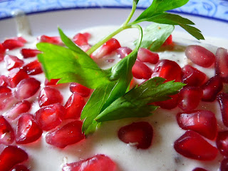 So the basic framework is a large, mild poblano chile, stuffed, covered in a cool, creamy walnutty sauce, topped with pomegranite pips (!). The stuffing is comprised of (and I only know because I asked) peanuts, ground meat, potato, beans, coriander, banana, cinnamon, apples, peaches, pears and onion.